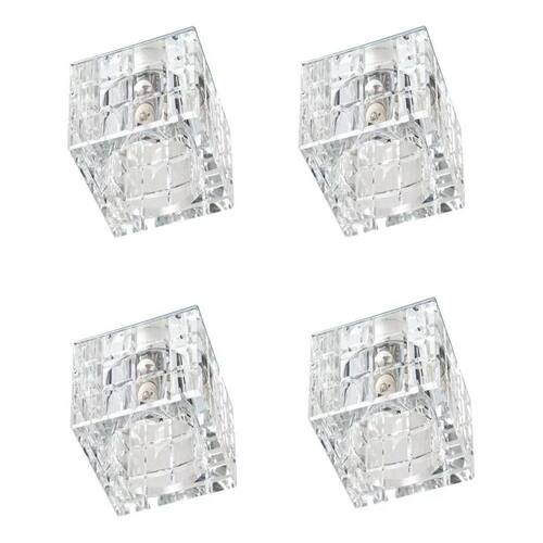 Kit com 04 unidades Descrição: - Material: Cristal Transparente e Metal Cromado; - Dimensões do cristal: CxLxA : 7 x 7 x 5 cm - Dimensões da base: CxL : 7 x 7 cm - Recorte no teto: CxL : 6x6 cm - Quantidade de Lâmpadas: 1 - Bocal: G9 - Potência Máxima: 40W - Tensão: Bivolt; - Garantia: 1 ano Lâmpada não inclusa