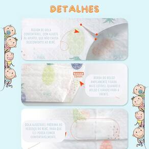 Babadores descartáveis são ideais para bebês que estão conhecendo o mundo dos alimentos eles fazem as refeições serem mais limpas e práticas. Cada babador é uma combinação de três camadas: a externa é resistente e não têxtil, a intermediária é altamente absorvente, e a interna, em contato com a pele, é impermeável, garantindo conforto e higiene. Materiais 100% atóxicos.