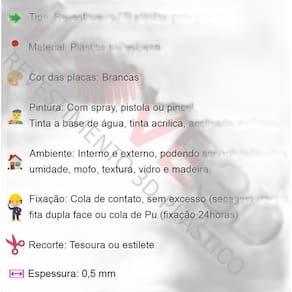 1- Você mesmo consegue instalar, não precisa de um ; 2- Material resistente, o relevo não amassa e não afunda; 3- Instalação sem sujeira e sem quebra quebra; 4- Ideal para paredes com umidade, mofo, textura, madeira e azulejo; 5- Serve tanto para áreas internas, quanto externas; 6- É lavável; 7- Durabilidade de 10 anos; 8- Não precisa de pintura; 9- Instalação com fita dupla face ou cola de contato; 10- Cortes das placas é a laser.