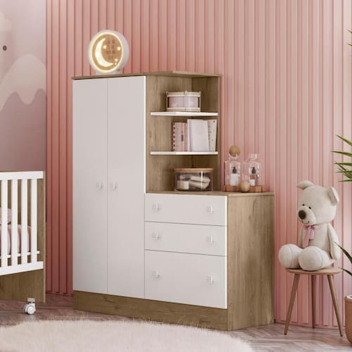 Pensado para quem precisa de otimização no espaço, este guarda roupa com cômoda é perfeito para acomodar os objetos do bebê com praticidade e comodidade.