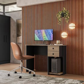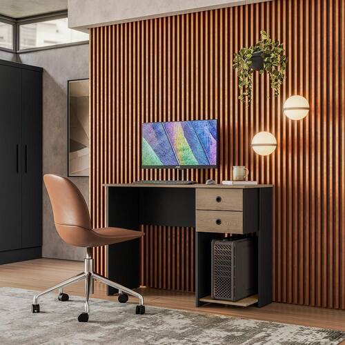 Possui uma prateleira elevada para o CPU e duas gavetas para melhor organizar seus objetos.