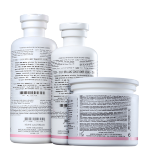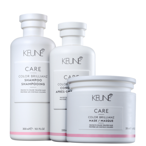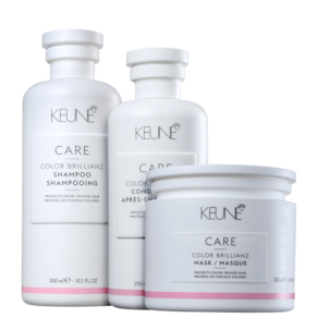 Kit com shampoo, condicionador e máscara para cabelos coloridos. Keune Care Color Brillianz Trio estabiliza a cor e evita o desbotamento, garantindo luminosidade por mais tempo para um resultado de cor radiante.
