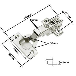 A Dobradiça tem a montagem simples, realizada através do deslizamento da dobradiça sobre o calço, que possui regulagem lateral vertical e horizontal para melhor alinhamento das portas e é fixada no calço de fixação no sistema slide-on deslizante