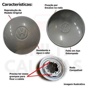 Centro de roda produzida em metal estampado com cromado autêntico. Possuindo segura e prática aplicação através de grampos na roda. Calota Centro de Roda para o Volkswagen Fusca Kombi anos 1970. CARACTERÍSTICAS: - Calota em Metal Estampado - Cor: cinza com brilho - Modelo: Standard - Fixação: Grampos na Roda não inclusos - Alta Qualidade e Resistência ITENS INCLUSOS: - 4 Calota Centro de Roda. DIMENSÕES: individual - Diâmetro: 26.5 cm - Altura: 6 cm INSTALAÇÃO A instalação é feita de forma simples, podendo ser feita por você mesmo. de 30 dias para defeitos de fabricação. SOBRE O ENVIO Envio podendo ser feito até o próximo dia útil após confirmação de pagamento. em até 3 , em caso de boleto POLÍTICA DE TROCA Sempre estamos interessados em sua satisfação. Caso não receba o produto exatamente como no anúncio, com algum defeito ou no transporte, Você poderá trocar e devolver a qualquer momento, sem pressa, sem prazo e principalmente sem custos desde que o produto esteja sem uso e na mesma condição da data da compra . No caso de devolução por compra de tamanho errado, desistência ou mudança de intenção, Neste caso o cliente deve arcar com o custo da devolução da mercadoria e nós arcamos com o custo de reenvio Da mercadoria nova. Marca: Não Informado