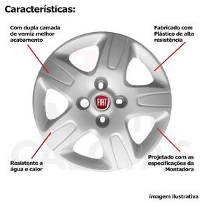 Calota em Plástico de Alta resistência, Fabricado pela Grid Calotas com os mesmos padrões e exigências da montadora. Com logotipo incluso. SERVE: Fiat Strada - todos Fiat Palio Adventure - todos Fiat Nova Fiorino - somente a nova CARACTERÍSTICAS: - Fabricado em Plástico Resistente - Com dupla camada de verniz - Resistente a água e calor - Feito de acordo com os padrões da montadora - Fixação: por Parafusos - Furação: 4x100 - Cubo: Alto - Cor: Prata - Referência: 111ca - Marca: Grid Calotas ITENS INCLUSOS: - Um 1 Kit com Quatro 4 Calotas com Emblema Incluso. DIMENSÕES Unitário - Diâmetro: 39 cm - Altura: 4 cm INSTALAÇÃO A instalação é feita de forma simples, podendo ser feita por você mesmo. Não necessita retirar todos os parafusos. de 30 dias para defeitos de fabricação.