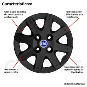 4x calota fiat uno mille palio siena aro 13 preto 072cb Calota em plástico de alta resistência, Fabricado pela grid calotas com os mesmos padrões e exigências da montadora. Com logotipo incluso. Jogo de calotas para o fiat uno - palio - elba - premio - siena todos os anos aro 13. Não serve nos fiat strada - fiat palio adventure - fiat nova fiorino Características: - fabricado em plástico resistente - com dupla camada de verniz - resistente a água e calor - feito de acordo com os padrões da montadora - fixação: por parafusos - furação: 4x100 - cubo: baixo - cor: preto - referência: 072cb - marca: grid calotas Itens inclusos: - um 1 kit com quatro 4 calotas para roda aro 13 com emblema incluso. Dimensões unitário - diâmetro: 37 cm - altura: 4 cm Instalação A instalação é feita de forma simples, podendo ser feita por você mesmo. Não necessita retirar todos os parafusos. de 30 dias para defeitos de fabricação. Sobre o envio Envio podendo ser feito até o próximo dia útil após confirmação de pagamento. em até 3 , em caso de boleto Política de troca Sempre estamos interessados em sua satisfação. Caso não receba o produto exatamente como no anúncio, com algum defeito ou no transporte, Você poderá trocar e devolver a qualquer momento, sem pressa, sem prazo e principalmente sem custos desde que o produto esteja sem uso e na mesma condição da data da compra . No caso de devolução por compra de tamanho errado, desistência ou mudança de intenção, Neste caso o cliente deve arcar com o custo da devolução da mercadoria e nós arcamos com o custo de reenvio Da mercadoria nova. Marca: Não Informado