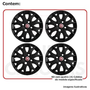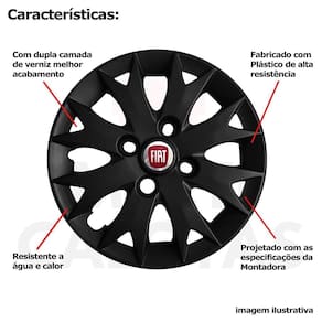 Calota em Plástico de Alta resistência, Fabricado pela Grid Calotas com os mesmos padrões e exigências da montadora. Com logotipo incluso. SERVE Fiat Uno - até 2013 Fiat Elba - Todos Fiat Premio - Todos Fiat Fiorino - até 2013 Fiat Palio - Todos Fiat Siena - até 2016 NÃO SERVE Fiat Strada - cubo de roda incompatível Fiat Palio Adventure - cubo de roda incompatível Fiat Nova Fiorino - cubo de roda incompatível Fiat Grand Siena - aro de roda maior CARACTERÍSTICAS: - Fabricado em Plástico Resistente - Com dupla camada de verniz - Resistente a água e calor - Feito de acordo com os padrões da montadora - Fixação: por Parafusos - Furação: 4x100 - Cubo: Baixo - Cor: Preto - Referência: 158CB - Marca: Grid Calotas ITENS INCLUSOS: DIMENSÕES Unitário - Diâmetro: 37 cm - Altura: 4 cm INSTALAÇÃO A instalação é feita de forma simples, podendo ser feita por você mesmo. Não necessita retirar todos os parafusos. de 30 dias para defeitos de fabricação. Marca: Não Informado Ean: 7899207635794