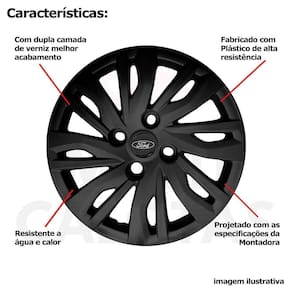 CARACTERÍSTICAS: - Fabricado em Plástico Resistente - Com dupla camada de verniz - Resistente a água e calor - Feito de acordo com os padrões da montadora - Fixação: por Parafusos - Furação: 4x108 - Cubo: Baixo - Cor: Preto - Referência: 344CB - Marca: Grid Calotas