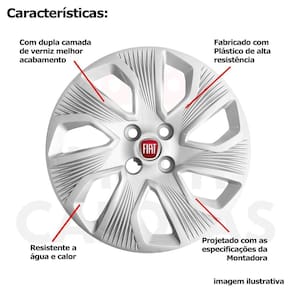 CARACTERÍSTICAS: - Fabricado em Plástico Resistente - Com dupla camada de verniz - Resistente a água e calor - Feito de acordo com os padrões da montadora - Fixação: por Parafusos - Furação: 4x100 - Cubo: Padrão - Cor: Prata - Referência: 214cb - Marca: Grid Calotas