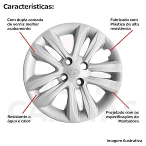 CARACTERÍSTICAS: - Fabricado em Plástico Resistente - Com dupla camada de verniz - Resistente a água e calor - Fixação: por Parafusos - Furação: 4x100 - Cubo: Baixo - Cor: Prata - Referência: 191cb