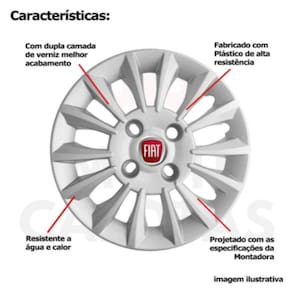 CARACTERÍSTICAS: - Fabricado em Plástico Resistente - Com dupla camada de verniz - Resistente a água e calor - Feito de acordo com os padrões da montadora - Fixação: por Parafusos - Furação: 4x108 - Cubo: Baixo - Cor: Prata - Referência: 0015cb - Marca: Grid Calotas