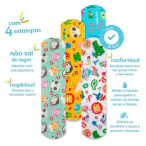 Atraente para crianças: as estampas coloridas e divertidas ajudam a transformar a experiência de cuidar de machucados em um momento mais leve e tranquilo. Higiene garantida: embalados individualmente, os curativos permanecem limpos e prontos para uso a qualquer momento. Conforto e segurança: materiais de alta qualidade que não irritam a pele e permitem a respiração adequada do machucado. Indicações de uso:
