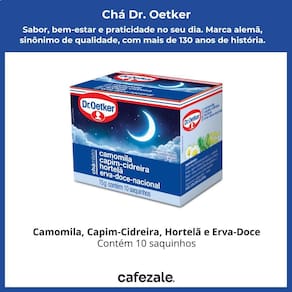 Ingredientes: Camomila, capim cidreira, hortelã, erva doce, aroma natural de ervas. Informações para alérgicos: Pode conter traços de glúten. Condições de armazenamento: Conservar em local seco e fresco. Após aberto, manter bem fechado. Validade estimada: 12 a 24 meses. Fabricante: Dr. Oetker.