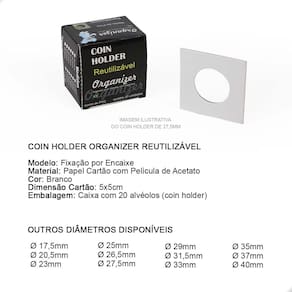 O Coins Holder Reutilizável é uma importante ferramenta para armazenar e proteger suas Moedas. É um produto utilizado por colecionadores e coleções de todos os níveis: do iniciante ao avançado. Garante o bom armazenamento e proteção de suas peças.O Coins Holder tem como função proteger sua moeda:- evita o contato com o ambiente externo- evita o manuseio incorreto da peça (sem luvas ou com a mão suja)- facilita a exposição de sua peça na sua coleção- facilita a logística de sua peça, permitindo que você leve em eventos- excelente organizador, pois centraliza a moeda no bolso da folha, deixando sua exibição muito mais bonita, organizada e apresentávelNo critério de organização, o Coins Holder se destaca ao promover a padronização da exposição de suas moedas. Tenha uma apresentação muito mais bonita e profissional utilizando Coins Holders.CARACTERÍSTICAS:Modelo: Fixação por Encaixe (Reutilizável)Material: Papel Cartão Branco com Película de AcetatoDimensão Cartão Fechado: 5x5cmDiâmetro deste Anúncio: Ø 20,5mmEmbalagem: Caixa com 20 alvéolos (coins holder) cada caixaOBS: Isento de PVCSUGESTÃO DE ARMAZENAMENTO DO COINS HOLDER COM A MOEDAO Coins Holder pode ser armazenado em folhas próprias para coleções de Moedas respeitando o espaço mínimo de 5x5cm cada bolso onde o holder será colocado, caixas organizadoras e separadoras, estojos (cartelas dobráveis) próprios para Coins Holders.COMO UTILIZAR:1- Para utilizá-lo você deve primeiramente arrastar uma das películas de acetato para um dos dois lados do coin holder.2- Encaixe a moeda no orifício do papel.3- Reposicione a película em sua posição inicial.
