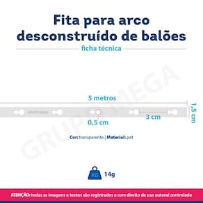 Fita corrente para arco descontruído de balões 5m Anúncio referente a 5 unidadesFaça da sua festa de aniversário ou festa infantil um verdadeiro espetáculo Com a nossa fita para arco desconstruído de balões, você poderá criar decorações incríveis, cheias de cores e alegria. As crianças vão se encantar com a magia que os balões trazem para a festaCaracterísticas:Super fácil de usarFeita com materiais recicláveis a partir de garrafas petPermite você criar arranjos personalizados incríveis e em pouco tempoCompatível com diferentes tamanhos de bexigas ReutilizávelCompatível com balões laminados, bubbles e balões de látex de qualquer tamanhoEspecificações técnicas:Marca: GH3 Festas e Eventos Modelo: Fita para arco desconstruído de balões 5m Quantidade: 1 unidadeMaterial: PETCor: transparenteComprimento: 5mEspaçamento: 3cmLargura: 1,5cmObrigado pela visita e boas comprasATENÇÃONossas imagens e textos são registrados e com direito de uso autoral controlado e reservado a essa loja e as lojas parceiras devidamente autorizadas em contrato.