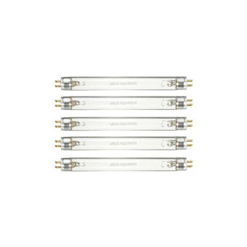 Kit 5 lâmpadas UV tubular fluorescente T5 germicida UV-C 4W para esterilização de ambientes, água e reposição filtro UV.Composição do kit: 5 lâmpadas germicida de 4W T5 UV-CLeia atentamente o anúncio antes da compraNossa lâmpada tubular germicida UV foi desenvolvida com tecnologia de ponta para garantir a mais alta qualidade e eficiência em desinfecção, é a escolha ideal para garantir um ambiente livre de germes e uma água cristalina para seu aquário ou lago.Principais Características:Eficácia comprovada na eliminação de bactérias, vírus e outros micro-organismos nocivosA lâmpada UV-C germicida é uma poderosa ferramenta para manter ambientes saudáveisDeixa a água cristalina do lago ou aquário Livre de produtos químicos, a luz UV-C não deixa resíduos tóxicos no ambiente, no ar ou na água tratadaPode ficar ligada 24h por diaTubular / linearTubo de quartzo transparente4 pinos, dois em cada pontaNecessita de reator próprio para lâmpada UVNecessita de equipamento próprio para desinfecção de ambientes ou um filtro UV para esterilização de águaNunca manuseie a lâmpada com ela ligada, não exponha olhos e pele à radiação da lâmpada. Aplicação - Para que serve a lâmpada ultravioleta - UV-C germicida:Peça de reposição para filtro ultravioleta UV de lago ou aquário.Manter a água do aquário ou lago cristalina e livre de micro-organismos que possam prejudicar a saúde dos peixes e plantas.Tratamento de água e esgoto.Desinfecção de ambientes como hospitais, farmácias, restaurantes, academias, transporte público, indústrias alimentícias e outros locais que necessitam manter o ambiente seguro e livre de patógenos.Especificações técnicas:Marca: Mega AquáriosModelo: Lâmpada UV UV-C germicida fluorescente ultravioleta 4WRadiação: Emite radiação UV de onda com um pico de 253.7 nm UV-C Potência: 4WVoltagem: 110V / 220V pode ser ligada nas duas voltagens conforme ligação do reatorTamanho: 15cm pino a pinoDiâmetro: T5Soquete: G5Pinos: 4Formato: tubularMédia de vida útil: 8.000hPeso: 16g.Necessita reator específico para lâmpada fluorescente de 4W.A lâmpada germicida também pode ser conhecida como:Lâmpada UV-C, lâmpada germicida, GL, lâmpada esterilizadora, luz ultravioleta C, luz uv.Como usar a lâmpada UV ultravioleta para esterilizar água: É necessário a utilização de um esterilizador ou filtro UV, nunca coloque a lâmpada ultravioleta UV-C diretamente na água sem um equipamento próprio. A utilização de materiais para vedação como: silicone, Durepox e outros materiais semelhantes não garantem a vedação correta, podendo passar água para os pinos e consequentemente a queima da lâmpada, caracterizando uso indevido e a perda da garantia. Utilize sempre material apropriado como anéis de vedação de borracha.Como descartar a lâmpada UV corretamente:Procure pontos apropriados de coletas específicos para materiais reciclados como lâmpadas e resíduos eletrônicos.Nunca jogue lâmpadas tubulares no lixo comum, pois elas contêm metais pesados e outros materiais perigosos.IMPORTANTEJamais exponha os olhos ou a pele à radiação emitida pela lâmpada UV ultravioleta, sob risco de danos gravíssimos irreversíveis aos olhos além de queimaduras na pele. A utilização de equipamentos de segurança é obrigatória.Obrigado pela visita e boas comprasATENÇÃONossas imagens e textos são registrados e com direito de uso autoral controlado e reservado a essa loja e as lojas parceiras devidamente autorizadas em contrato.