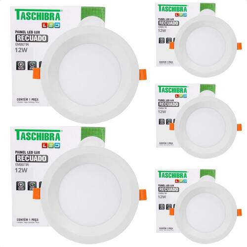 Kit 5 Painel de Led Redondo Embutir Recuado 12W Bivolt Taschibra 6500K Frio Características Gerais do Produto: Dimensões AxLxP CM : 1,6 x 12 x 12 Formato: Redondo Nicho do recorte CM : 11X11 Cor da luz: 6500K Frio Produzido em: Plástico de Engenharia, Anti-UV, Driver Onboard, Placa Interna em Alumínio e Componentes Eletrônicos Voltagem: Autovolt Utilizado em 110v e 220V Alimentação: Energia elétrica Cor acabamento: Branco Potência: 12W Fluxo luminoso: 720 Lumens IRC: 80 Ângulo de abertura: 120 : 1 ano junto ao fabricante Aplicação: Embutir Vida útil: 20.000 horas Acompanha lâmpada: Não necessita, LED já integrado Grau de proteção: IP20 Ajuste de intensidade Dimerizar : Não Acompanha o produto: 05 Painel Led Completo : 1 ano junto ao fabricante