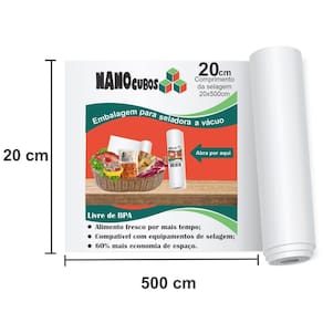 5 Rolos Nanocubos 20x500cm Sacos Ranhura para Seladora A Vácuo Embalagens 5 rolos NANOCUBOS 20 cm X 500 cm para seladoras a vácuo. Embalar produtos a vácuo é a melhor forma de mantê-los sempre protegidos por muito mais tempo. Ao embalar alimentos, a validade deles é completamente estendida, pois eles não terão nenhum contato com o ar e serão pouco afetados pela ação do tempo. Você pode embalar tanto alimentos crus como alimentos já preparados para serem consumidos em outro momento. Você economiza muito dinheiro e evita o desperdício Os sacos para vácuo Nanocubos são produzidos com alta tecnologia em Nylon Poli seguindo padrões de qualidade internacional. Possuem 12 micras, 3 barreiras de proteção, sem presença de BPA Não tóxicos e funcionam com equipamentos de embalagens a vácuo. Além de alimentos, é possível utilizá-lo com objetos pessoais, documentos ou utensílios, conservando-os como novos por muito tempo e aumentando sua vida útil. Características do produto: - Aparência: Transparente com ranhuras; - Forma disponível: Rolos, é possível montar sacos do tamanho que quiser; - Quanto ao uso: Reciclável pode utilizar várias vezes seguidas; - Iniciação ao rasgo: Difícil; - Propagação ao rasgo: Difícil; - Temperatura máxima de uso: 120 C; - Resistência a ácidos: Excelente mantendo o cheiro do alimento; - Resistência a óleos e gorduras: Excelente; - Segurança alimentar: Conserva o alimento. Conteúdo da Caixa 5- Rolos 20 cm X 500 cm. Políticas da loja: - : contra defeitos de fabricação, 90 dias; - Prazo de envio: imediato após a confirmação do pagamento; - Cancelamento: Realizamos a devolução total do dinheiro; Qualquer dúvida estamos à disposição Marca: Não Informado