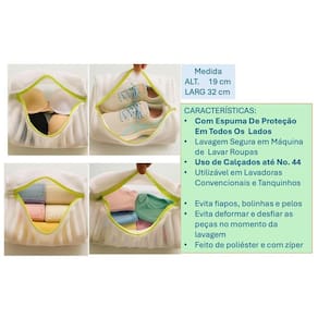 Proteja seus calçados durante a lavagem Este saco especial foi desenvolvido para evitar fiapos, bolinhas e pelos, mantendo suas peças limpas e preservadas. Além disso, previne deformações e desfiados, garantindo que seus calçados saiam como novos.