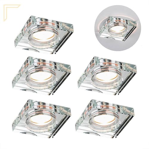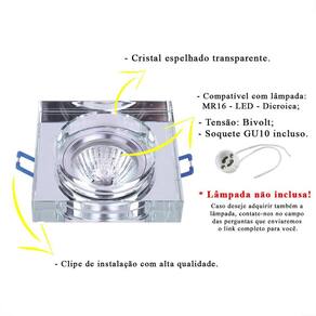 - Material: Cristal espelhado transparente e metal cromado - Dimensões: L 8,9 cm x C 8,9 cm A 2 cm - Recorte no teto :7x7 - Quantidade de lâmpadas: 01 - Bocal: GU10 - Modelo da lâmpada: MR16 - Potência máxima: 50W