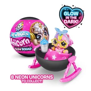 Desembrulhe, descasque e revele o novo unicórnio recém-nascido do esquadrão de brilho! Depois de desencaixotar seu brilho fofo no unicórnio escuro, a magia continua fluindo com toda a nova cápsula conversível se transformando em um banho ou berço. Monte o banho, encha-o com água fria e mergulhe seu unicórnio para revelar uma fralda surpresa que muda de cor. Uma vez que a hora do banho acabou, vista-os com suas roupas brilhantes! Existem 8 unicórnios para coletar, incluindo o raro unicórnio alienígena brilhante!
