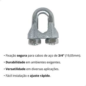 5 un grampo para cabo de aço 3/4 presilha para cerca elétrica Tamanho: 3/4 - 19,05 mm Quantidade: 5 un grampo para cabo de aço 3/4 Especificações técnicas: ======================== Tamanho: 3/4 polegadas - 19,05 mm Qualidades e diferenciais: ========================== Fixação segura; Instalação fácil e rápida; Durabilidade em ambientes exigentes; Versatilidade em diversas aplicações; do vendedor: 90 dias Marca: Não Informado