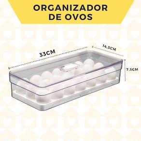 ORGANIZADOR DE OVOS - 21 UNIDADES - 3,6L O organizador de ovos com tampa clear fresh é o novo padrão de transparência na organização da sua geladeira. Empilhe, encaixe e enxergue facilmente os ovos armazenados na geladeira, mantendo tudo em ordem. Seu design foi pensado para permitir armazenagem no interior da geladeira ao invés da porta, evitando troca de temperaturas constantes que podem deteriorar os ovos, mantendo uma rotina sem desperdícios. Produzido em material resistente, super transparência, beleza e cuidado com o alimento são características da linha, perfeitas para auxiliar na organização da sua geladeira e facilitar o seu dia a dia.