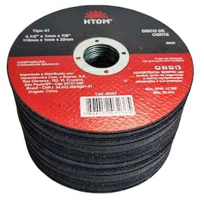 Kit com 50 Discos de Corte Fino 4 1/2 Pol. 115mm para Esmerilhadeira Inox Metal HTOMDisco de corte 115mm indicado para cortar inox e metal com esmerilhadeiras. Furo de 22mm e espessura de 1mm.- Marca: Htom- Referência: HTOM-40563- Kit com 50 Discos- Diâmetro: 4-12 115mm - Furo: 7/8 22m - Espessura: 1mm- Indicado para corte de metais em geral e aço inoxidável- Rotação máxima: 13.300 rpm- Composição: corundum branco- Garantia: 90 dias contra defeito de fabricação