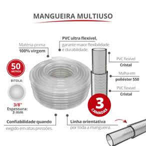 💎 BENEFÍCIOS DO PRODUTO • Construção Reforçada (3 Camadas): 1. Duas camadas de PVC flexível cristal. 2. Uma camada de Malha Poliéster 550 (fio de poliéster trançado e fios paralelos) para maior resistência. • Alta Pressão e Confiabilidade: Reforçada para garantir maior resistência e confiabilidade em altas pressões, suportando até 10 kgf/cm². • Flexibilidade e Durabilidade: Produzida em PVC ultra flexível com material 100% virgem, garantindo longa vida útil e fácil manuseio. • Linha Orientativa: Possui linha orientativa por toda a mangueira, auxiliando na instalação e alinhamento. • Multiuso: Ideal para o segmento agroindustrial e aplicações residenciais.