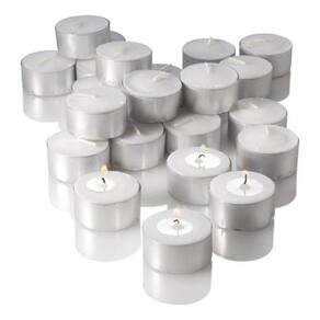 50 Velas Rechaud Brancas Em Suporte Alumínio - 4hrs Queima Embalagem com 50 velas, tipo rechaud, feitas em parafina e armazenadas em suporte de alumínio