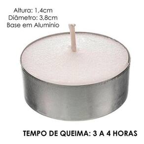 Características: - Flutuantes: Podem ser utilizadas na água - Dimensões das velas: Diâmetro: 3,8 cm e Altura: 1,2 cm unidade - Peso: 13 gramas unidade - Tempo de queima aproximado: 3 a 4 horas por vela