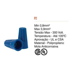 50 x conector de torção emenda fios cabos azul 0,8 - 3,9mm os conectores de torção emendam cabos flexíveis e fios rígidos de forma prática e segura. Ao contrário da fita isolante que resseca com o calor e o tempo os conectores mantém a emenda isolada por muito mais tempo. Protegida por uma capa isolante, encontra-se a mola interna que se expande para acomodar firmemente os condutores e os mantém unidos sob pressão constante, sem danificá-los, para soltar os fios basta girar o conector no sentido anti-horário, podendo ser em outra conexão. Especificações aplicação: 0,8 a 3,9mm soma dos cabos, ex: fio 1,0mm + cabo 1,5mm=2,5mm temperatura: até 105ºc. Voltagem: até 300 volts aprovação ul/csa