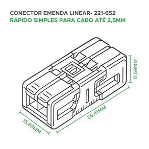 Este conector emenda rápida linear dupla da série 221 oferece uma solução prática e eficiente para emendar dois pares de fios e cabos com seções transversais que variam de 0,2 a 2,5mm. Com capacidade de corrente de até 24A e tensão máxima de 450V, é ideal para diversas aplicações elétricas de baixa potência, tanto residenciais quanto comerciais.