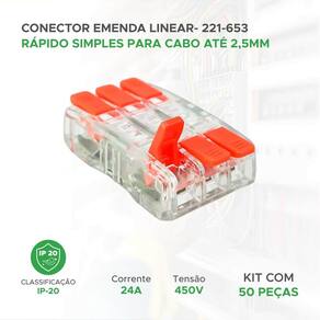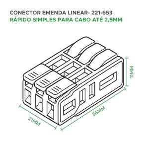 Este conector emenda rápida linear tripla da série 221 oferece uma solução prática e eficiente para emendar três pares de fios e cabos com seções transversais que variam de 0,2 a 2,5mm. Com capacidade de corrente de até 24A e tensão máxima de 450V, é ideal para diversas aplicações elétricas de baixa potência, tanto residenciais quanto comerciais.