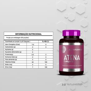 Ingredientes: peptideos bioativos de colágeno, vitamina c , blisglicinato de zinco. Composição da cápsula: gelatina, água purificada, umectante glicerina e dióxido de titânio .
