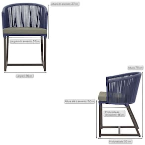 Combinando estilo e resistência, esta cadeira traz o melhor do design contemporâneo em alumínio com micro pintura e acabamento em corda náutica. O estofado impermeável completa o conforto e a funcionalidade, tornando-a ideal para ambientes externos e internos.