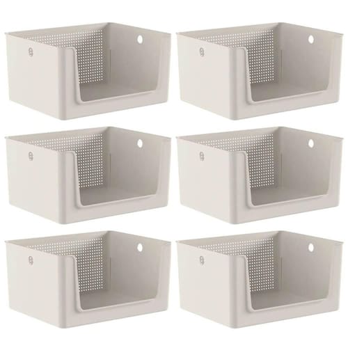 6 Caixas Organizadoras Flow 16L Cestos Bege Abertura Frontal Banheiro Lavanderia Escritório.