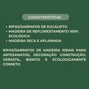 Características: Ripas/Sarrafos de mandeira aplainada. Madeira Ecológia, proveniente de reflorestamento sustentável Sem nenhum tipo de tratamento Madeira natural de Eucalipto Madeira seca Cantos retos