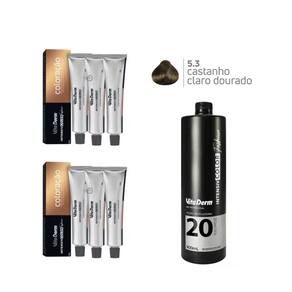 Coloração Vita Derm 6 Unidades 5.3 + 1 Unidade Ox 20 Vol 900ml Coloraçao Intensive Color Fashion, hidrata e nutre gradualmente o cabelo. Aumenta a emoliencia e maciez dos fios. Promove o brilho duradouro. Tem efeito revitalizante. Deixa as cores mais vibrantes e intensas.