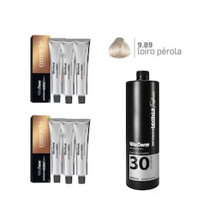 Coloração Vita Derm 6 Unidades 9.89 + 1 Unidade Ox 30 Vol 900ml Coloraçao Intensive Color Fashion, hidrata e nutre gradualmente o cabelo. Aumenta a emoliencia e maciez dos fios. Promove o brilho duradouro. Tem efeito revitalizante. Deixa as cores mais vibrantes e intensas.