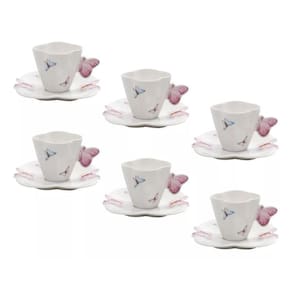 Apresentamos o conjunto 6 xícaras de café de porcelana com pires borboletas branco 100ml.