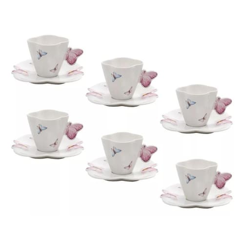 6 Xícaras De Café E Pires Porcelana Borboletas Branco 100Ml