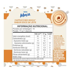 Ingredientes Cápsula Leite: Leite integral em pó, açúcar, leite condensado em pó, gordura de coco, estabilizantes fosfato de potássio e citrato de sódio, sal, regulador de acidez hidróxido de potássio.