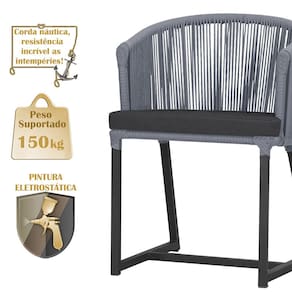 Combinando estilo e resistência, esta cadeira traz o melhor do design contemporâneo em alumínio com micro pintura e acabamento em corda náutica. O estofado impermeável completa o conforto e a funcionalidade, tornando-a ideal para ambientes externos e internos.
