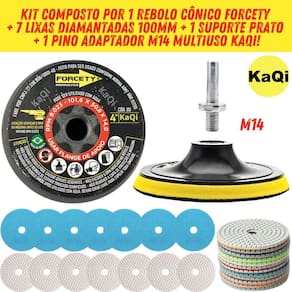 7 Lixas Grão 4 Pol. 100mm Diamantada + 1 Rebolo Cônico 45 Graus + 1 Disco Prato + 1 Pino M14 KaQi GRÃO: 50x7 Kit 7 Lixas Diamantadas Grão Disco 4 Polegadas 100mm KaQi + 1 Rebolo Grão 120 Copo Cônico 45 Graus 4 Polegadas M14 Forcety. + 1 Suporte Prato Disco 100mm M14 KaQi + 1 Pino Adaptador Multiuso Rosca Universal M14 KaQi. Para Desbastes, Polimentos, Acabamentos, Boleamentos, Lixamentos a Seco e Úmido. Ideal para profissionais e entusiastas de reformas e construção. Transforme o acabamento das suas superfícies com o Kit 7 Lixas Grão 4 Pol. 100mm Diamantada + 1 Rebolo Cônico 45 Graus + 1 Disco Prato + 1 Pino M14 Desenvolvido para oferecer o melhor polimento e acabamento, é perfeito para quem busca resultados profissionais, tanto em pedras como granitos, mármores, cerâmicas, quanto ardósia, calcário, dekton, quartzo, porcelanato, pedra projetada, concreto, nanoglass, super nano, vidro e muito mais. Seu lixamento pode ser a seco e a úmido, o que proporciona um processo mais rápido, sem gerar calor excessivo. Assim, é possível garantir um resultado sem manchas ou falhas, e ainda favorece um efeito brilho d'água incrível O Rebolo Copo Cônico 10x5cm Grão 120 Forcety é ideal para desbastes, retificações, boleamentos e acabamentos. Projetado para oferecer eficiência, durabilidade, confiabilidade e resultados excepcionais, é perfeito para profissionais e entusiastas de reformas e construções. Não à toa, é o rebolo número 1 das marmorarias, azulejistas e oficinas de todo Brasil O Disco 100mm e o pino adaptador M14 podem ser utilizados em conjunto com as lixas e com o rebolo. Com sistema de gruda e desgruda fácil, podem utilizadas em lixadeiras, esmerilhadeiras, politrizes, furadeiras, parafusadeiras. Permite, assim, ampliar a gama de usos do kit. Principais características: 1. Durabilidade extra, alta resistência ao desgaste, longa vida útil e desempenho, além de excelente performance em diversos tipos de materiais. 2. Acabamento impecável no desbaste e polimento de superfícies de pedra, mármore, calcário, ardósia, porcelanato e outros, sem deixar manchas ou marcas indesejadas. Pode ser trabalhada em superfícies claras ou escuras. Oferece uma remoção eficiente de material e um acabamento uniforme. 3. Versatilidade no uso com diversas ferramentas, já que pode ser Utilizado em esmerilhadeiras, lixadeiras, politrizes e furadeiras elétricas. 4. Eficiência de montagem, uma vez que possui sistema de fixação rápido. Basta encostar a lixa no suporte do disco para grudar, e, para remover, é só puxar na direção contrária. Conteúdo da embalagem: 7 Lixas DÁgua 4 Pol. 100mm Disco Diamantado KaQi GRÃO. + 1 Rebolo Grão 120 Copo Cônico 45 Graus 4 Polegadas M14 Forcety. + 1 Suporte Prato Disco 100mm M14 KaQi + 1 Pino Adaptador Multiuso Rosca Universal M14 KaQi. Especificações Lixas: Diâmetro: 100mm 4 Polegadas . Furo central: 1,3cm diâmetro. Espessura 1 unidade: 0,4cm. Maleabilidade: flexível. Lixamentos: seco e úmido. RPM: ideal entre 3000 a 5000 rotações por minuto. Material da lixa: diamante sintético industrial e resina premium. Costado: tipo vellcro. Fácil de fixar e remover. Especificações Rebolo: Trabalho: a seco ou refrigerado com água. Diâmetro: 4 Polegadas 100mm 10,16cm x altura 5,08cm. Velocidade: 9023RPM. Rosca: M14. Material: Carbeto de Silício SiC com diamantes. Feito para ser conforme norma ABNT NBR 15230. Especificações Prato Suporte: Diâmetro do disco: 100mm 4 Polegadas . Modelo do disco: M14 com superfície tipo vellcro. RPM: até 12000. Rosca: padrão M14 14mm . Especificações Pino Adaptador M14: Para Furadeira Parafusadeiras, Politrizes, Lixadeiras e Esmerilhadeiras. Fixa em discos pratos M14 para uso com lixas, boinas, espumas de polir, entre outros acessórios. Rosca: M14 14mm . Pino largura: 8mm. Altura: 4,4cm.