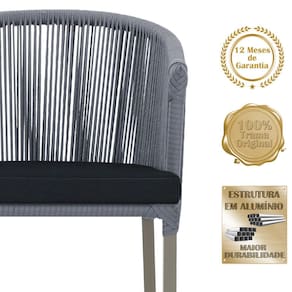 Combinando estilo e resistência, esta cadeira traz o melhor do design contemporâneo em alumínio com micro pintura e acabamento em corda náutica. O estofado impermeável completa o conforto e a funcionalidade, tornando-a ideal para ambientes externos e internos.