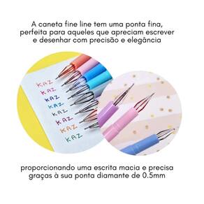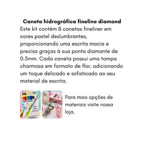 8 Caneta Hidrográfica Fineliner 8 Cores Pastel Diamond KZ720 Caneta Hidrográfica Fineline Diamond - Kit com 8 cores pastel Transforme sua escrita e desenhos com o kit exclusivo de 8 canetas hidrográficas Fineline Diamond. Cada caneta conta com uma ponta fina de 0.5mm, ideal para traços macios, precisos e delicados, perfeita para escrita, anotações, lettering e ilustrações. O grande diferencial está no design sofisticado: tampas em formato de flor que deixam seu material de papelaria ainda mais encantador. As cores pastel proporcionam um toque moderno e elegante, tornando este kit indispensável para estudantes, artistas e amantes de papelaria criativa.