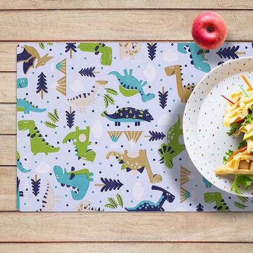 Jogo Americano Infantil Dinossauro Nada como um jogo americano divertido e alegre para deixar a hora da refeição um momento mais feliz e animado, possui forro e gravação com estampa de Dinossauros fundo azul claro. material flexível e impermeável são muito resistentes e fáceis de limpar, basta jogar os resíduos no lixo e passar um pano úmido ou lavar e estará limpo. Contém 8 peças Somos fabricantes, por isso o melhor preço para essa matéria prima. Um produto Idealiza Comercio de Utilidades Marca: Não Informado