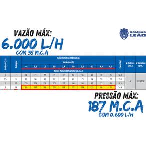 - 187 M.C.A x 600 L/H - 186 M.C.A x 1.200 L/H - 178 M.C.A x 1.800 L/H - 168 M.C.A x 2.400 L/H - 155 M.C.A x 3.000 L/H - 139 M.C.A x 3.600 L/H - 120 M.C.A x 4.200 L/H - 98 M.C.A x 4.800 L/H - 35 M.C.A x 6.000 L/H