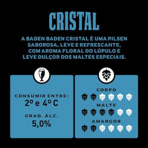 O Kit Cervejas Baden Baden é tudo que os apreciadores de uma boa cerveja desejam! Composto por 4 sabores de cerveja, o Kit Baden Baden conta com as cervejas: Cristal, IPA Puro Malte, Golden e a Peach. A Cristal é uma pilsen saborosa, leve e refrescante, com aroma floral do lúpulo e leve dulçor dos maltes especiais. A IPA é uma cerveja que equilibra o amargor do Lúpulo com o intenso aroma e sabor cítricos provenientes do lúpulo e da adição de suco de maracujá. A Golden é uma cerveja tipo ALE diferenciada, com sabor adocicado, coloração dourada e aroma marcante de canela e frutas vermelhas. A Peach é uma cerveja de trigo não filtrada que apresenta delicados aromas e sabores de pêssego, proporcionando uma intensa sensação de refrescância ao paladar. Adquira agora mesmo esse Kit Baden Baden e desfrute de uma explosão única de sabores!